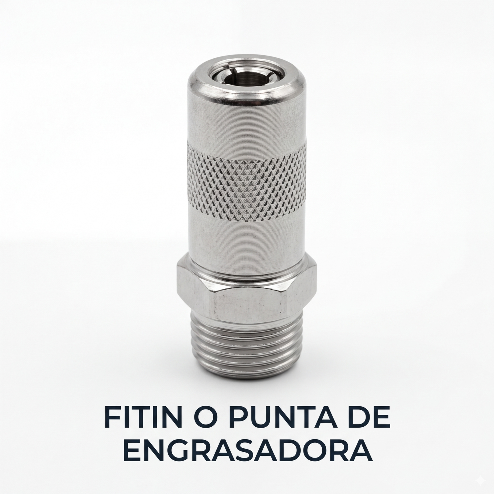 Su cuerpo está fabricado en acero de alta resistencia con acabado cromado para prevenir la corrosión y facilitar la limpieza. El diseño incluye un moleteado exterior que permite un agarre firme incluso con manos grasosas, facilitando su instalación y retiro. Es compatible con la mayoría de las mangueras y extensiones de engrasadoras manuales, neumáticas o de batería gracias a su rosca estándar industrial.