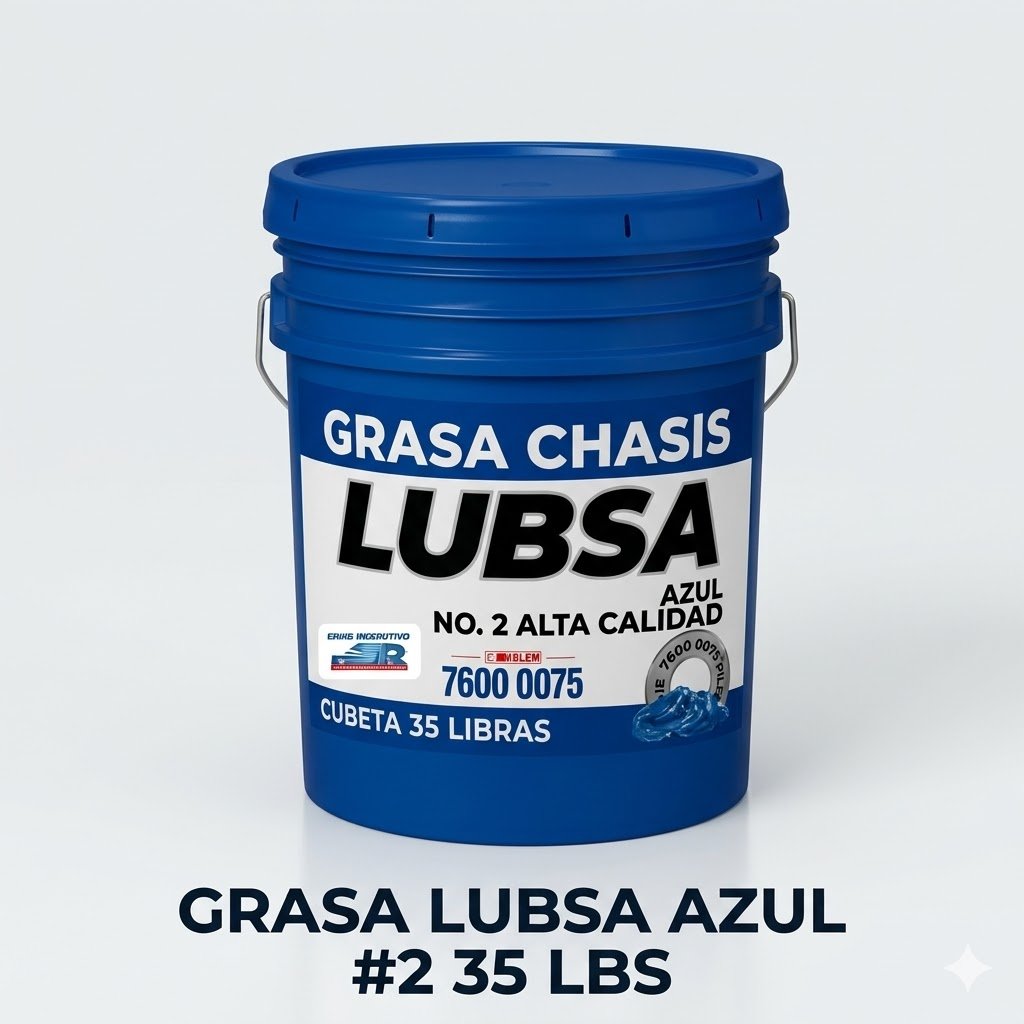 Grasa de chasis Lubsa Azul NLGI #2 en presentación de 35 lbs. Destaca por su alta adherencia y textura fibrosa, ideal para proteger componentes de vehículos pesados y maquinaria contra el lavado por agua, polvo y fricción extrema.