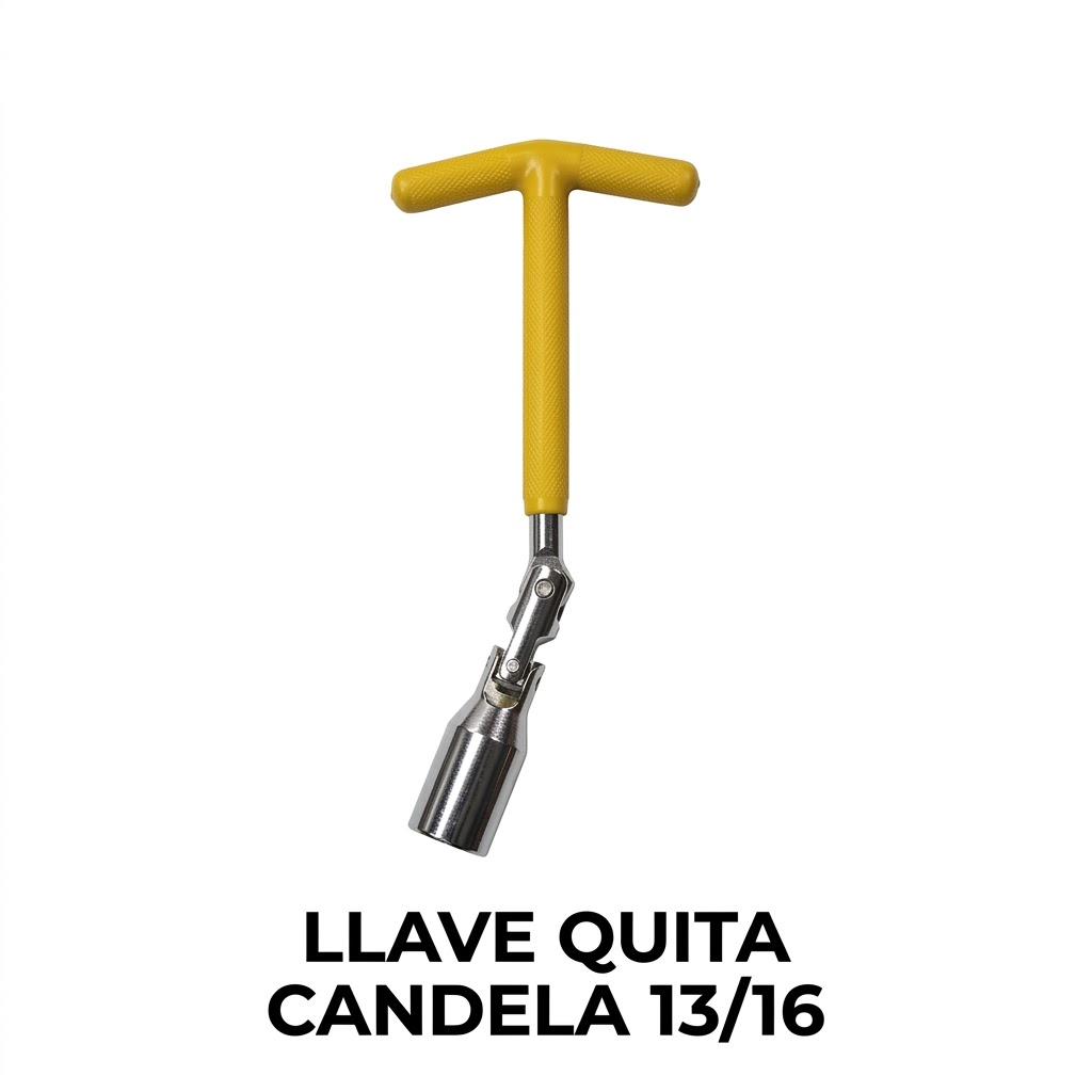 Llave tipo T de 13/16″ (21mm) para extraer candelas. Diseño articulado con cardán para acceso a lugares difíciles y mango ergonómico amarillo antideslizante. Incluye sujetador interno de caucho.