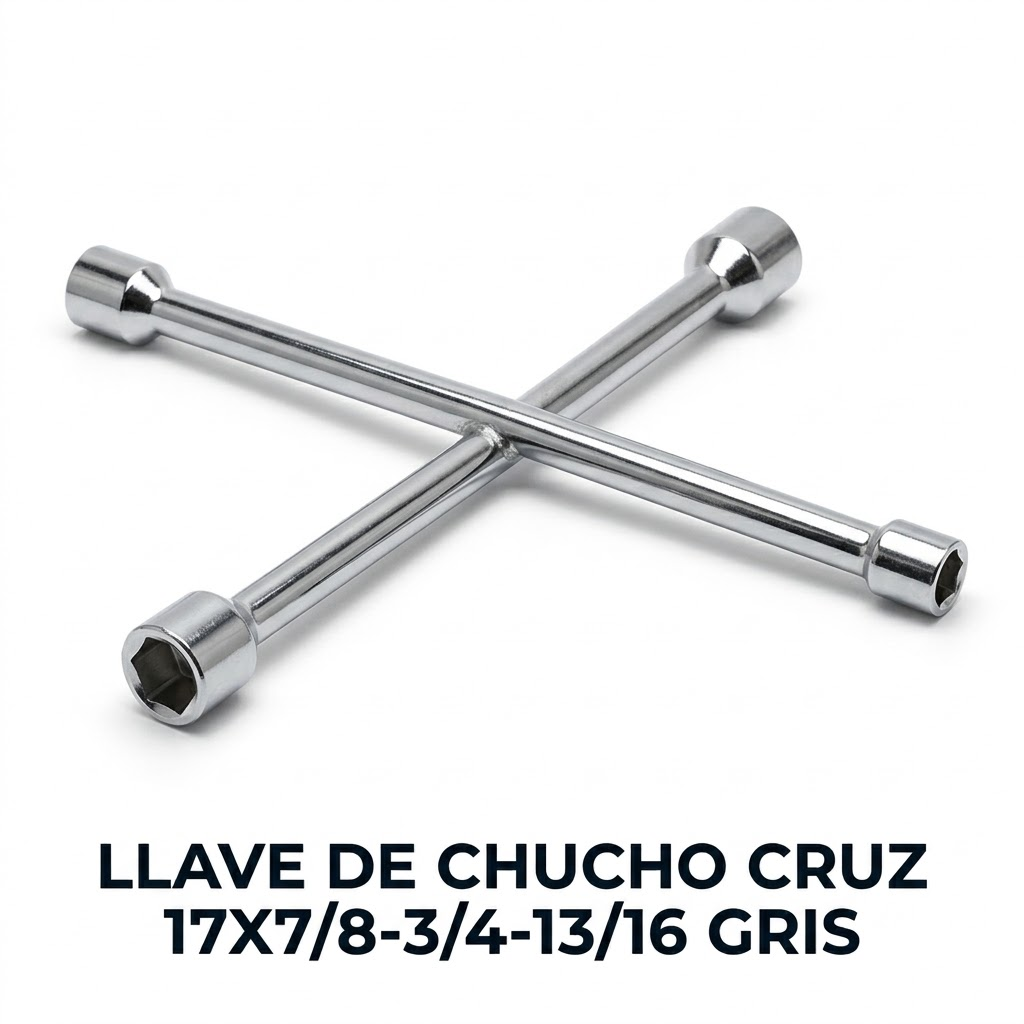Llave de cruz reforzada con 4 medidas de copa estándar (17mm, 19mm, 21mm, 23mm). Fabricada en acero de alta resistencia con acabado anticorrosivo gris. Diseño ergonómico de gran torque para cambio de llantas.