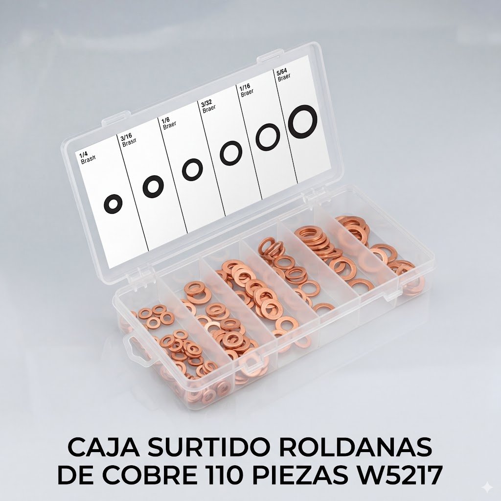 Kit profesional de 110 arandelas planas de cobre en 6 tamaños populares (desde 1/4″ hasta 5/8″). Fabricadas en cobre de alta pureza para garantizar un sellado hermético y una excelente conductividad. Incluye estuche organizador transparente.