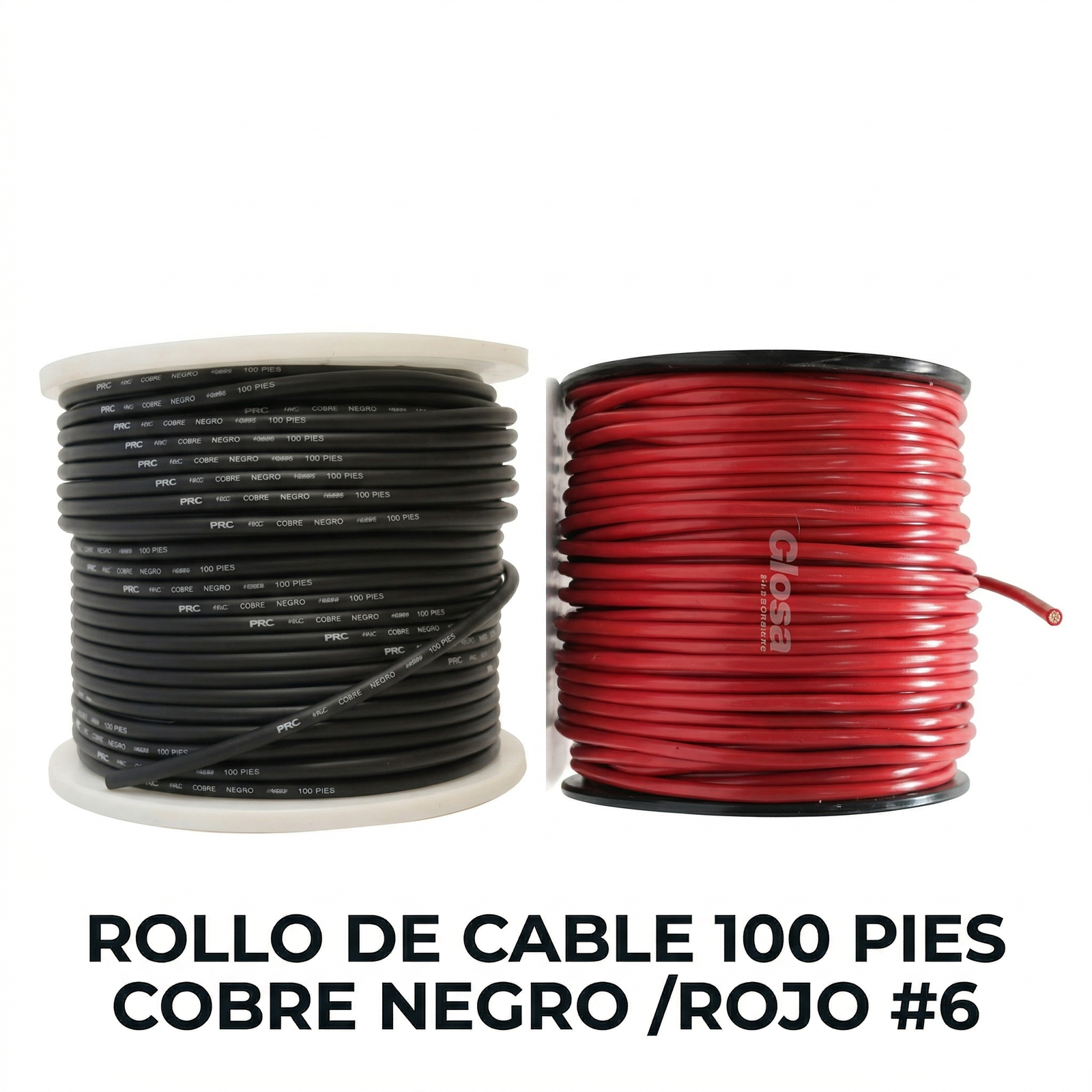 Rollo de 100 pies (30.5m) de cable de cobre Calibre 6 AWG. Diseñado para aplicaciones de alta potencia en sistemas automotrices, marinos y solares. Disponible en colores rojo y negro, con aislamiento resistente al calor y la abrasión para una máxima seguridad eléctrica.