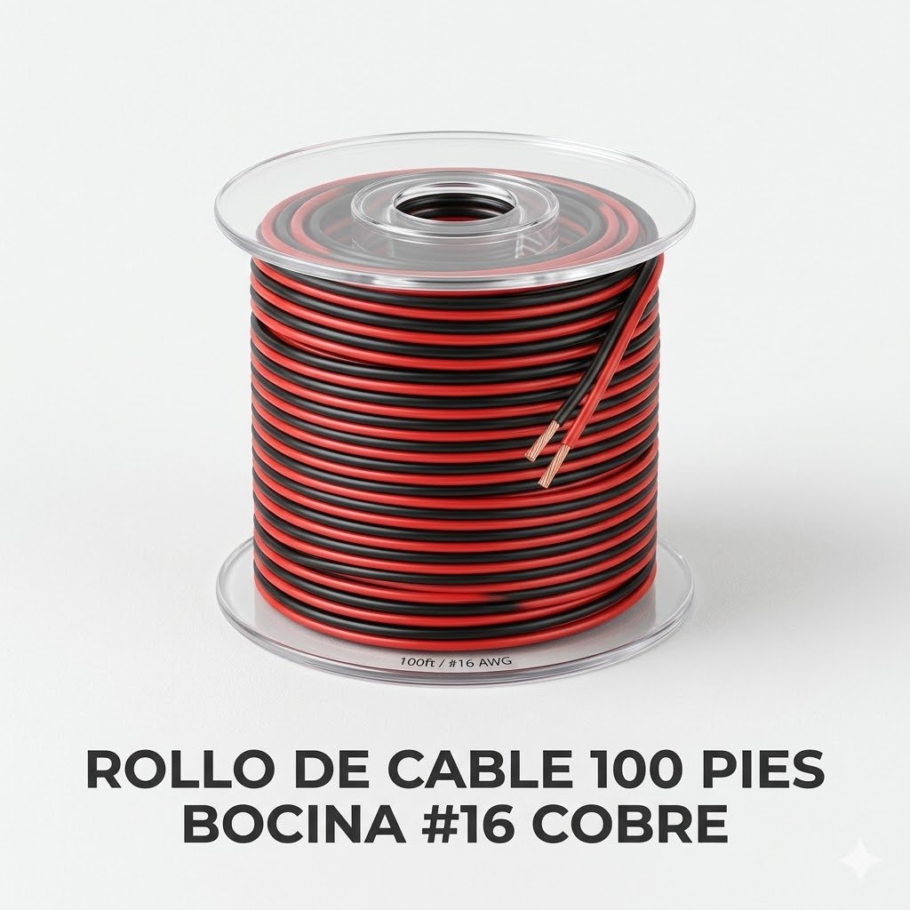 Rollo de 100 pies de cable dúplex para bocina, calibre #14 AWG, fabricado en 100% cobre. Diseño polarizado rojo/negro para una instalación fácil y segura. Ideal para sistemas de car audio, cine en casa y proyectos de sonido profesional.