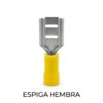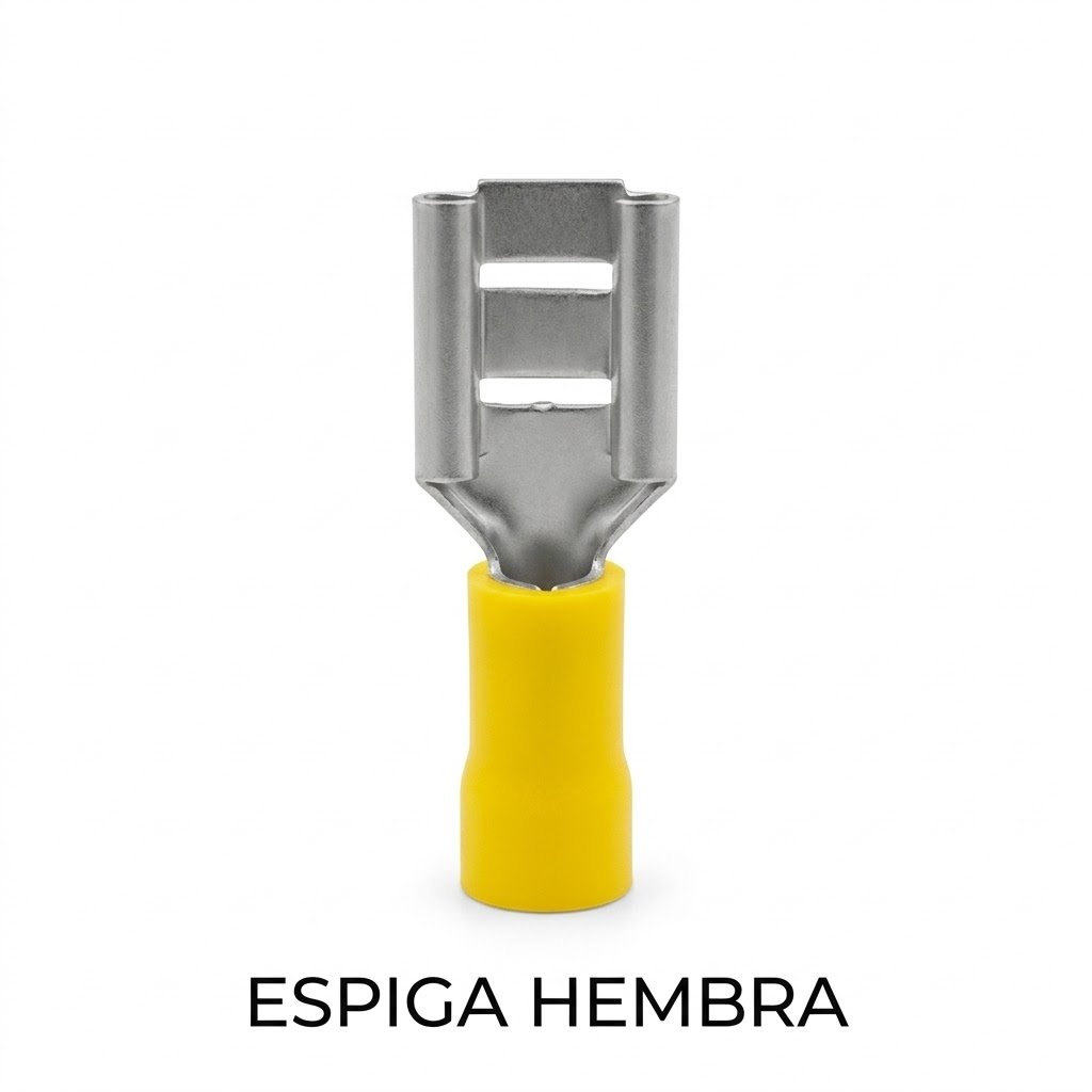 Terminal eléctrica tipo hembra pre-aislada en color amarillo. Ideal para conexiones de desconexión rápida en cables de calibre 12-10 AWG. Proporciona una unión segura, duradera y de fácil instalación mediante crimpado.